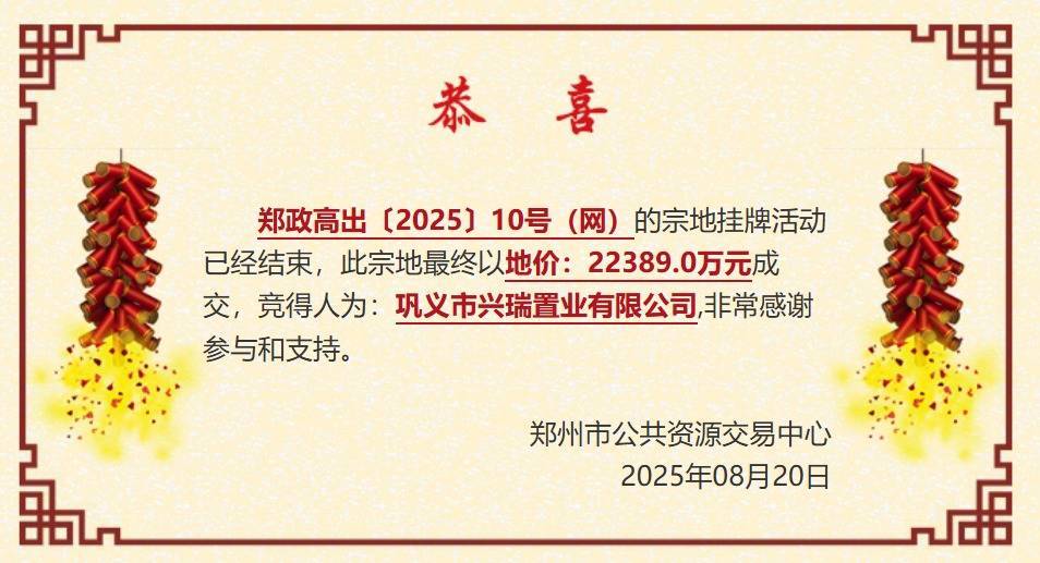 【大河财立方消息】8月20日,郑州高新区一宗宅地成功出让,巩义市兴瑞置业有限公司以2.34亿元拿下五龙口片区城改用地,溢价率5.66%。